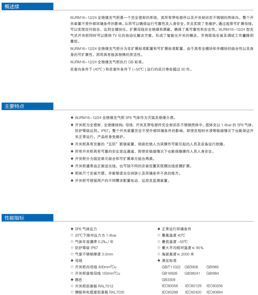 WJRM16-12/24全绝缘充气柜,已经在国家高压电器试验中心获得型式试验报告并被列为高新科技产品。广泛用于10kV/20kV配电系统,是城乡各类用户变配电系统的首选开关产品。