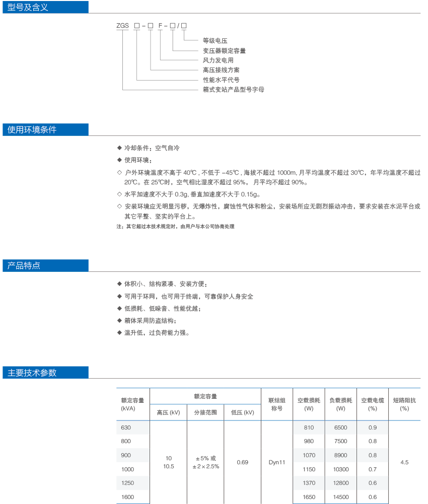 ZGS□-F/10kV风力发电用箱式变电站(美式)(以下简称箱式变),其结构 为“品”字型结构,变电站与高、低压设备相互紧密连为一体,其中,变电站三面外露在空气中,散热条件好,且能与高低压设备壳体分离,便于检修。