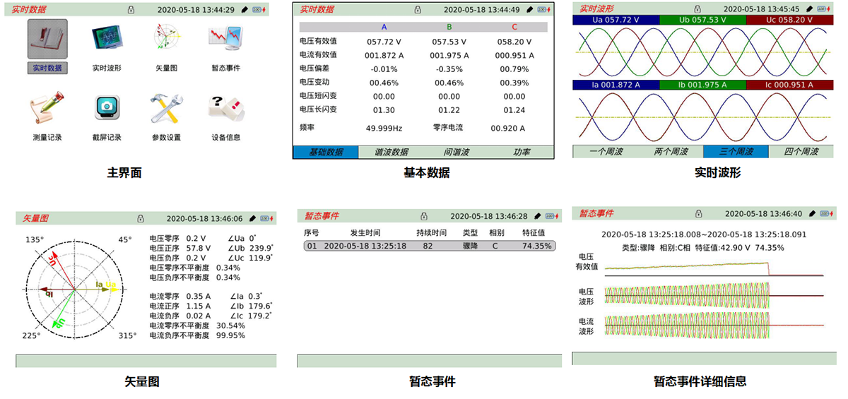 暂态事件 | 具备电压骤升、电压骤降、电压短时中断事件记录功能,具备手动录波功能。数据记录包括事件特征数据(电压有效值极值、事件持续时间等)及波形数据。测量方法满足IEC 6100-4-30和国标GB/T 18481-2001。 |